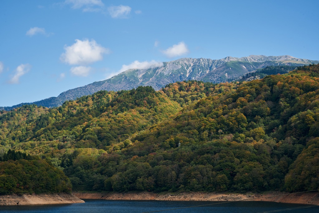 こちらは、ダムの堤体を渡った先の「有峰西岸線」から見た紅葉
