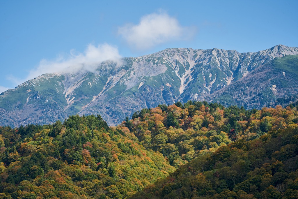 雄大な立山連峰、真っ白な雲、輝くオレンジの紅葉、青空を映したコバルトブルーの湖